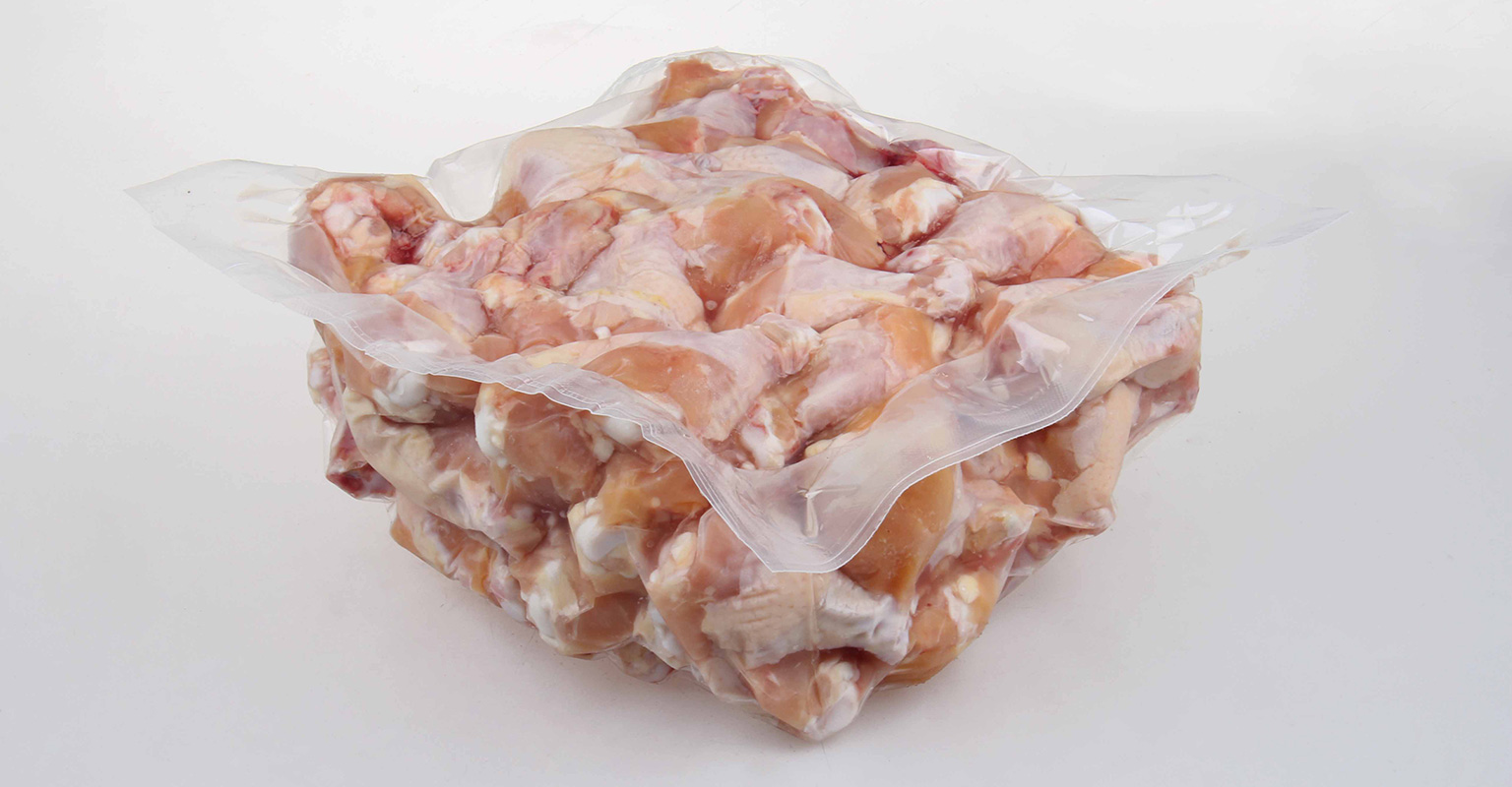 整鸡或鸡腿等部位包装常用真空,有效防止血水渗出。